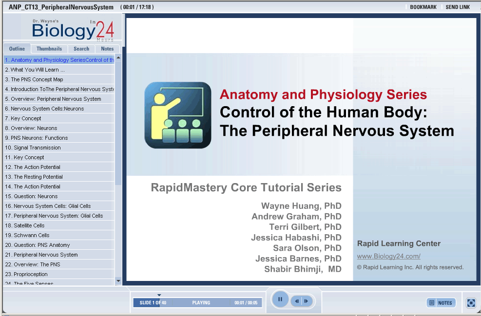 • This tutorial is all about the peripheral nervous system and its functions. Specific details about the signal transmission through the peripheral nervous system are discussed. The cell types unique to the peripheral nervous system will be presented and their function discussed.