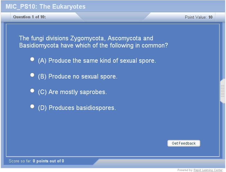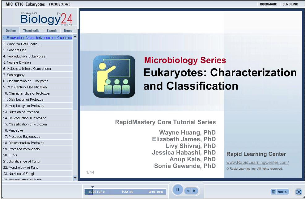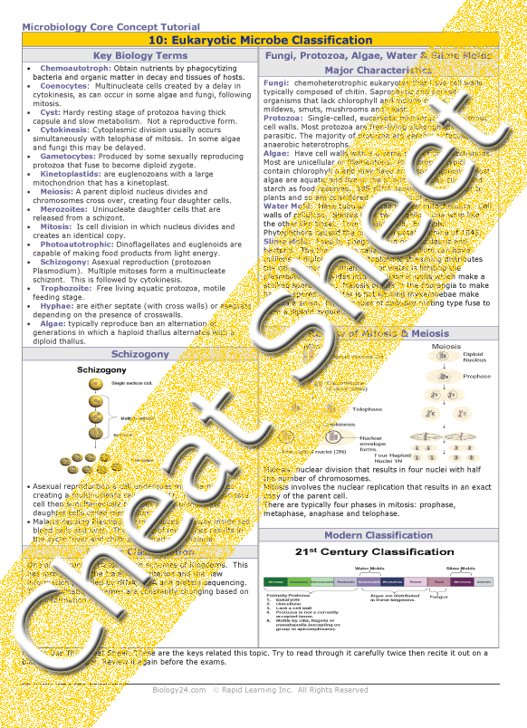 The taxonomy and classification of the eukaryotes: fungi, algae, protozoa and helminths (parasitic worms e.g. tapeworms, flukes) are introduce. Meiosis (sexual reproduction) is presented in a step by step process and contrasted with mitosis.