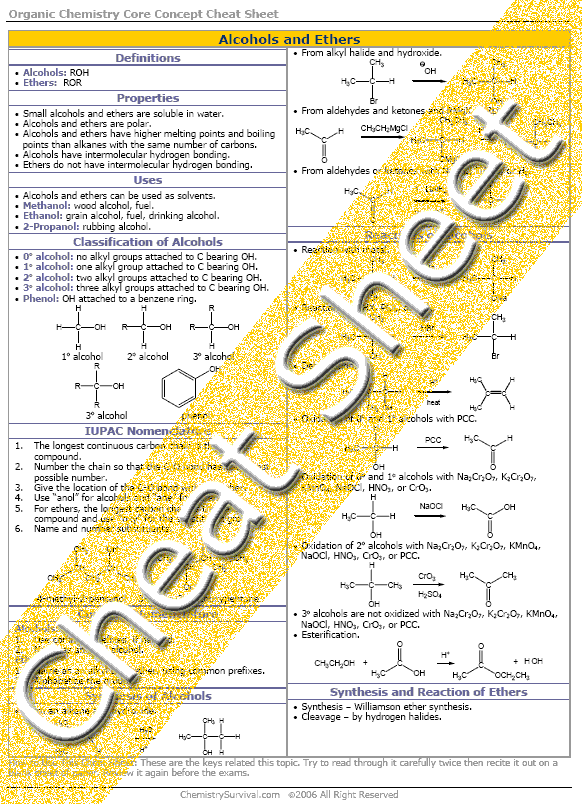 Alkoxide ions are formed from the reaction of alcohols with metal. Alcohols react with hydrogen halide, phosphorus trihalide, or thionyl chloride to form alkyl halides. Alcohols are dehydrated with acid and heat to form alkenes. Zero degree and primary alcohols are oxidized with pyridinium chlorochromate to form aldehydes. Zero degree and primary alcohols are oxidized with sodium dichromate, potassium dichromate, potassium permanganate, sodium hypochlorite, nitric acid, or chromium trioxide to form carboxylic acids. Secondary alcohols are oxidized with sodium dichromate, potassium dichromate, potassium permanganate, sodium hypochlorite, nitric acid, chromium trioxide, or pyridinium chlorochromate to ketones. Tertiary alcohols are not oxidized with sodium dichromate, potassium dichromate, potassium permanganate, sodium hypochlorite, nitric acid, chromium trioxide, or pyridinium chlorochromate. Alcohols react with carboxylic acids, in the presence of acid, to yield esters.
