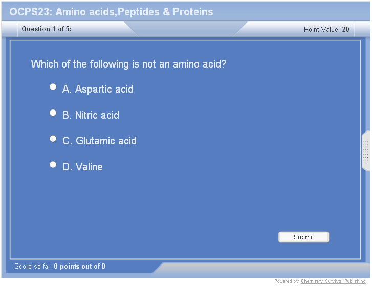 Proteins are among the fundamental molecules of biology. Proteins are linear polymers (chains) built from a repertoire of at least twenty monomer units. There are four classes of structure: primary structure, secondary structure, tertiary structure, and quaternary structure. The primary structure of peptides and proteins refers to the linear number and order of the amino acids present. In the secondary structure, the peptide backbone has bonding between the C_O and the NBH groups, either within the chain or between chains. A helical structure is formed from intramolecular hydrogen bonding. The ß-pleated sheet is another stable form, where the hydrogen bonding is between adjacent chains. Several chains can be involved in a sheet-like structure. A protein that completely lacks secondary structure is a random coil. A tertiary structure is the interactions of hydrogen bonding, hydrophobic interactions, electrostatic interactions, and van der Waals forces. Most proteins, particularly those with molecular masses 100 kD, consist of more than one polypeptide chain. These polypeptide subunits associate with a specific geometry. The spatial arrangement of these subunits is known as a protein=s quaternary structure.