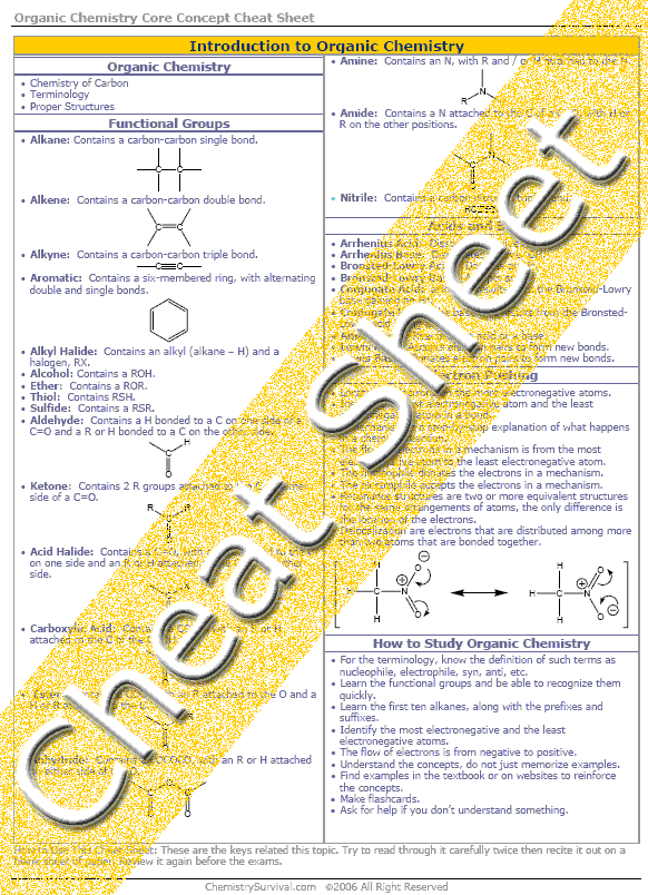 The background information for organic chemistry includes the chemistry of carbon and the language of organic chemistry. The structure of the functional groups are described. The functional groups are alkane, alkene, alkyne, aromatic, alkyl halide, alcohol, ether, thiol, sulfide, aldehyde, ketone, acid halide, carboxylic acid, ester, anhydride, amine, amide, and nitrile. The three types of acids and bases are Arrhenius, Bronsted-Lowry, and Lewis. In organic chemistry, it is important to know about electrons, mechanisms, resonance, and delocalization. To learn organic chemistry, a student must learn the terminology, functional groups, nomenclature, electrons, and mechanisms. Repetition of the concepts is important. Ask for help when needed.