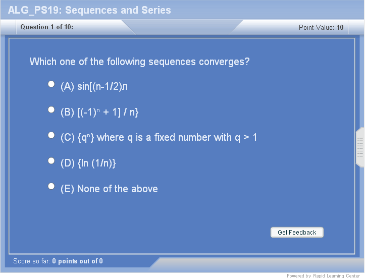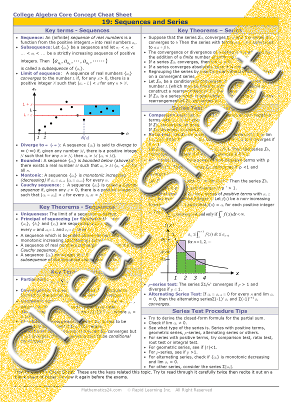 Infinite sequences Arithmetic and geometric progression Definition of sequences Recursive relations Limit of a sequence Divergence of sequences Operations of a limit Bounded and monotonic sequences Definition of Cauchy sequences Convergence of Cauchy sequences Subsequences Infinite series Arithmetic sum Geometric Series Basic properties of series Comparison test Ratio, root, integral, p-series and alternating series test |