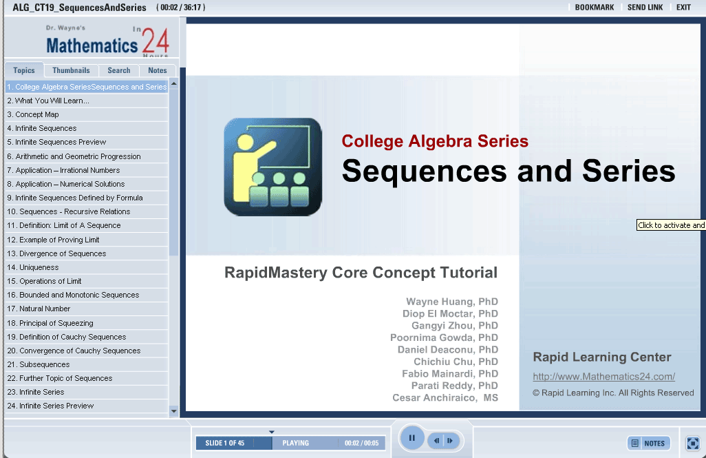 This tutorial specifically describes the concepts of infinite sequences and series. Examples are presented to with the basic operations and properties of infinite sequences. Applying some type of theorem to find the limit is important when dealing with sequences.