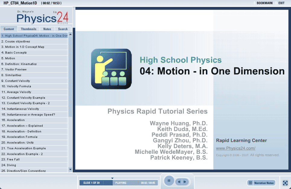 This tutorial describes motion in one direction.  Motion at a constant rate will be discussed.  In this type of motion the velocity remains the same.  Accelerated or changing motion will also be analyzed.  An example of this is a falling object that continually picks up speed as it descends.  The concept of vectors and scalars will be applied.  Various kinematic equations will be used to calculate various quantities in physics problems.  General problem solving hints will be applied to these formulas.